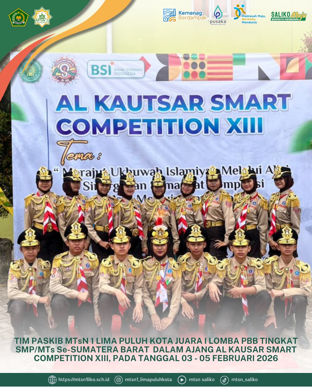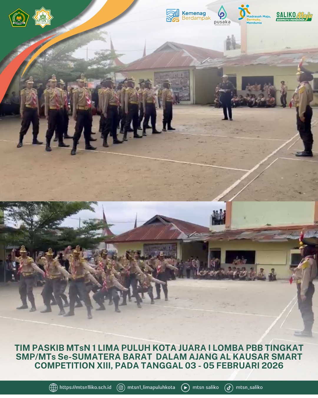 Lima Puluh Kota, Sumatera Barat – Tim Paskibra MTsN 1 Lima Puluh Kota kembali mengharumkan nama madrasah dengan meraih Juara 1 Lomba Peraturan Baris-Berbaris (PBB) dalam ajang Alkausar Smart Competition (ASC) Ke-XIII yang digelar pada 03–05 Februari 2026. Perlombaan ini mempertemukan regu paskibra dari berbagai SMP/MTs se-Provinsi Sumatera Barat dan menjadi salah satu ajang bergengsi tahunan untuk menguji disiplin, kekompakan, serta kemampuan baris-berbaris siswa.